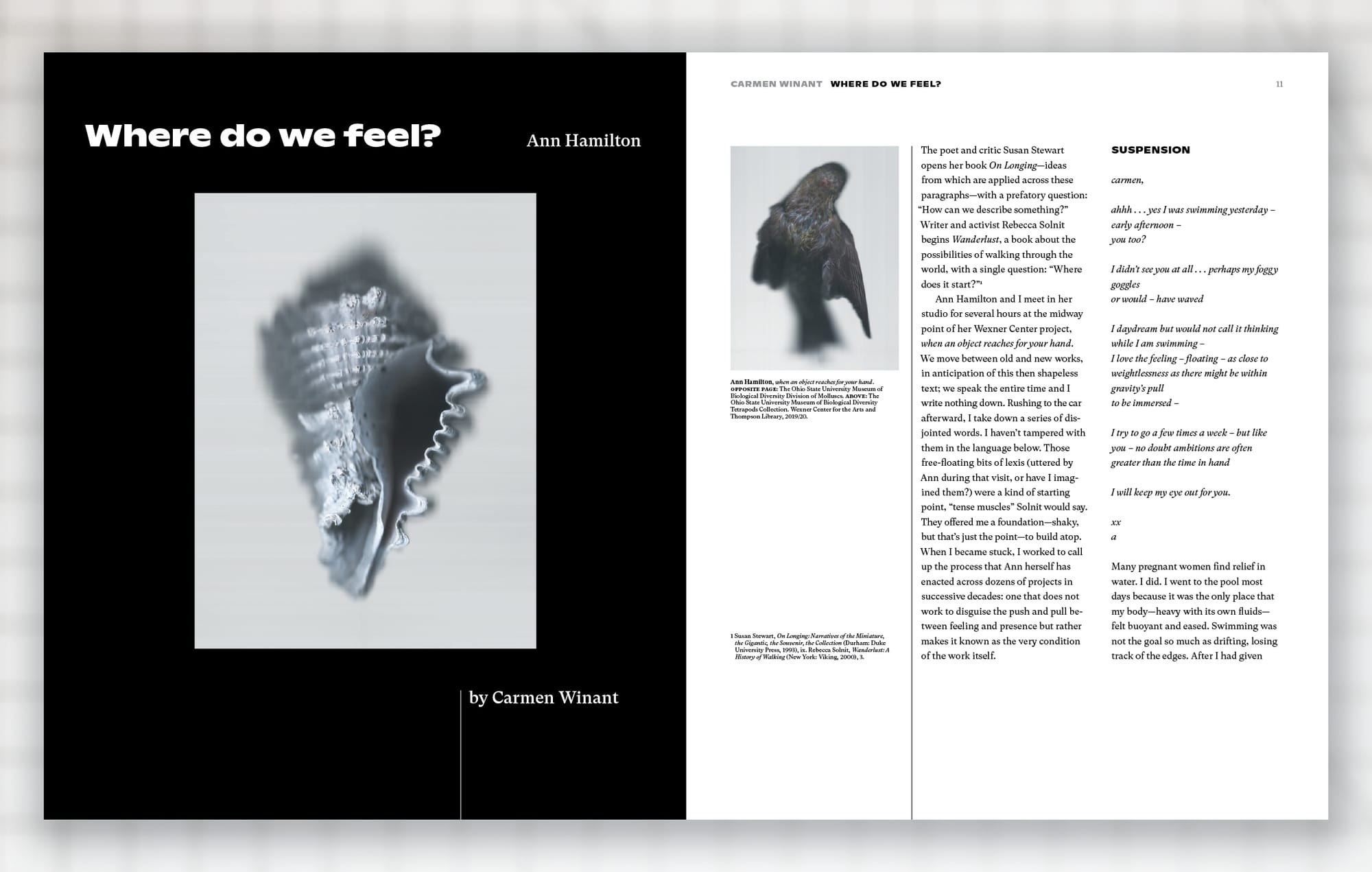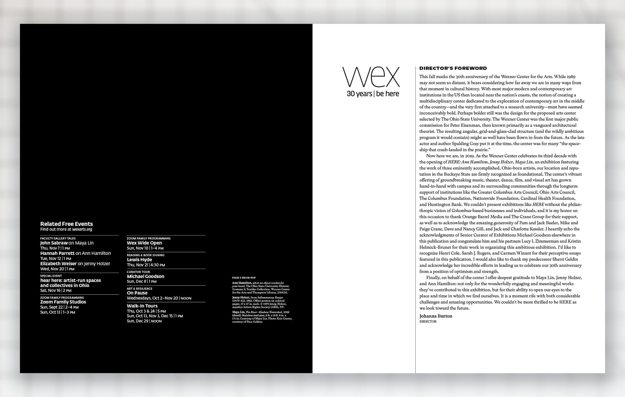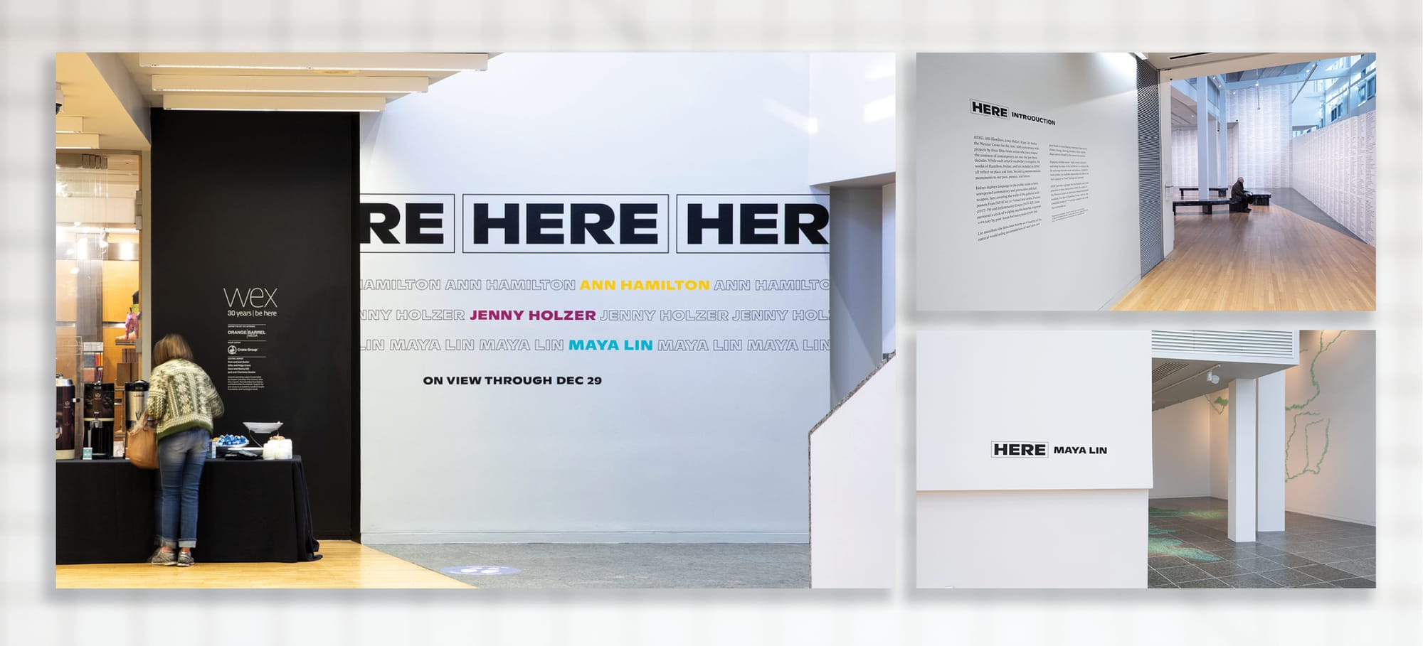 This graphic identity explores themes of time and place found in the exhibition HERE: Ann Hamilton, Jenny Holzer, Maya Lin. The design strategy evokes the themes through a repeating black and white typographic treatment of the title and artist names.
